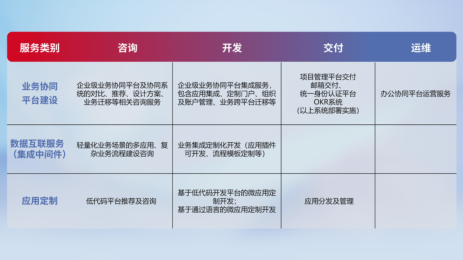 针对钉钉、、企微、、、IDaas等平台级产品提供产品的规划、、方案、、、、交付、、、、定制化开发等服务,,,实现如统一协同办公、、智能客户服务、、、、混合会议管理、、、智能数据查询、、等业务场景,,,,实现数字化转型。。