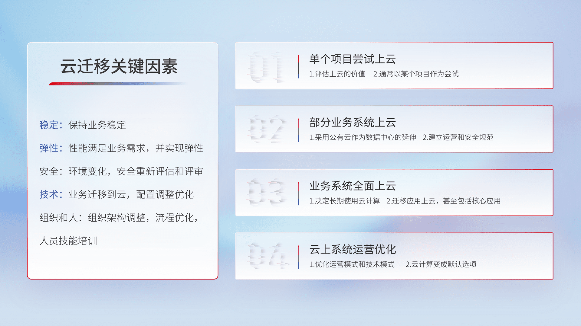 结合实际业务,,,,从规划设计、、云平台选型、、、云原生改造、、、数据迁移、、、集成交付,,迁移全过程为客户识别最佳上云路径,,,做好风险识别管理,,设计网络架构、、身份权限、、、、安全审计合规、、操作审计、、、、日志审计、、、、监控告警策略、、多站点容灾设计等,,,,对云上基础设施进行整体规划,,提升IT治理水平,,,,以满足弹性、、、、高可用、、高性能的需求。。。