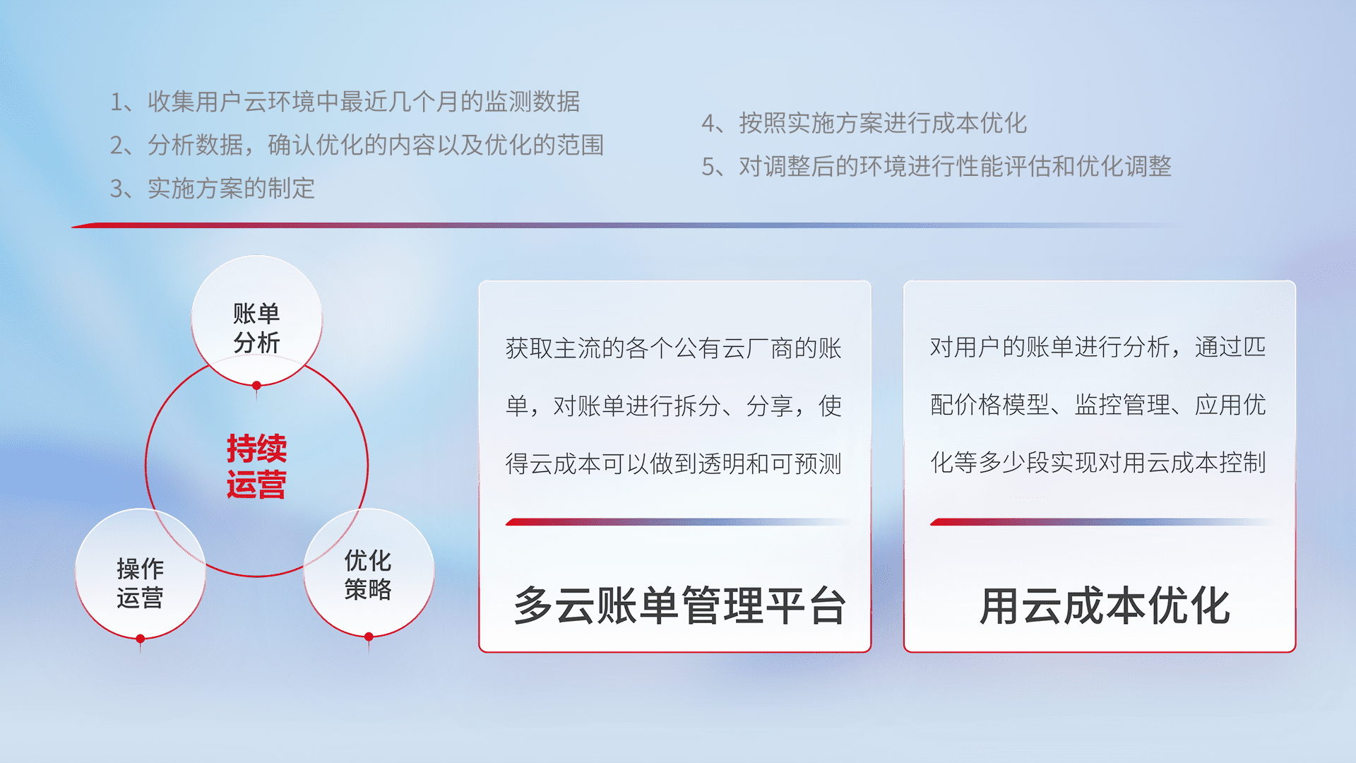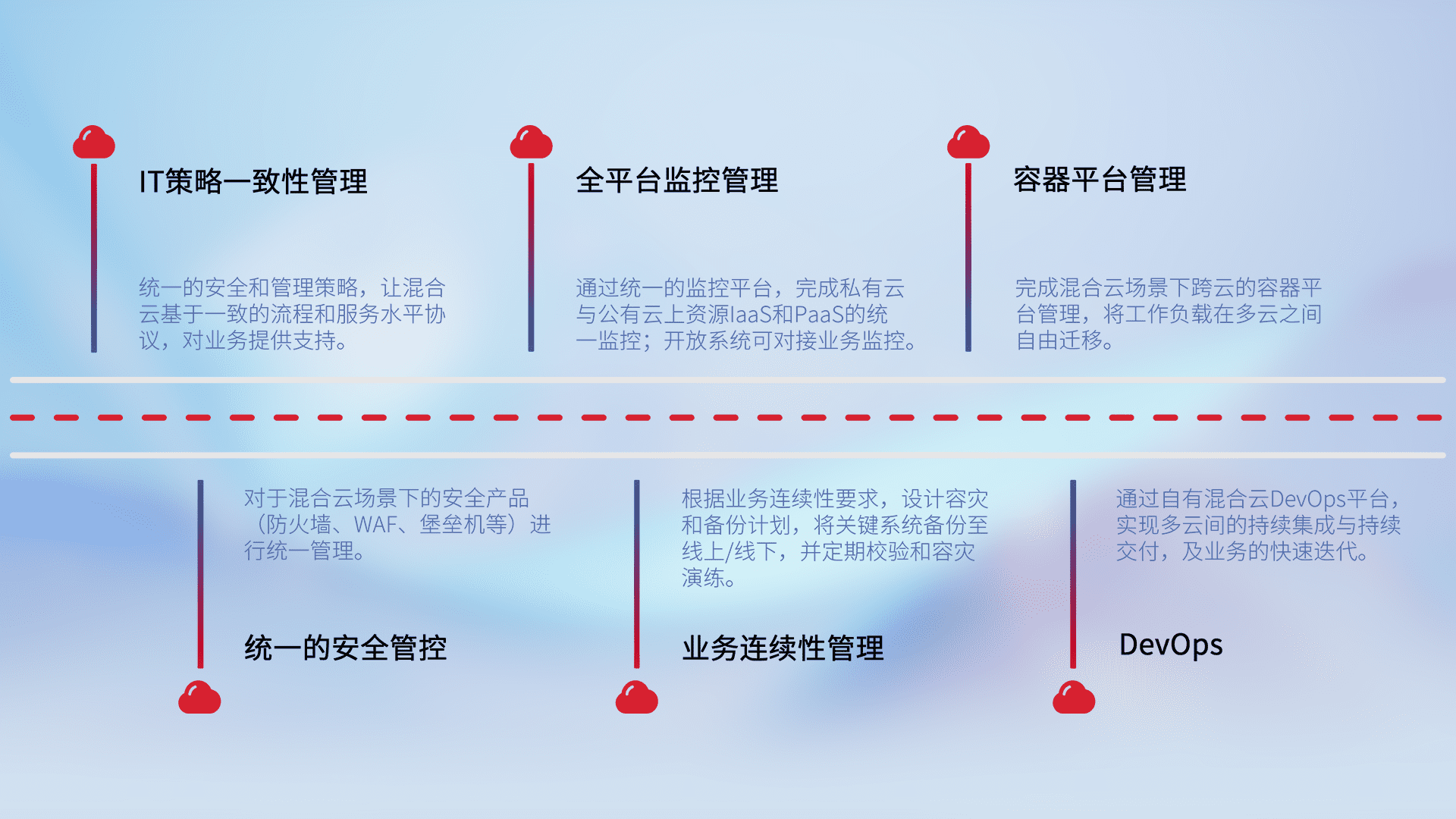 通过多云纳管,,以统一的资源数据模型把客户的云资源进行抽象和封装,,进而实现对多云资源的统一操作,,,,保障云资源管理的可靠性、、、、稳定性与可用性。。。。量身定制化运维内容,,,配置、、、开发运维、、、补丁管理、、、、备份、、、监控、、、、认证和访问管理、、审计和日常巡检等,,,,保障在用云过程中的可靠度,,稳定度以及高可用率。。